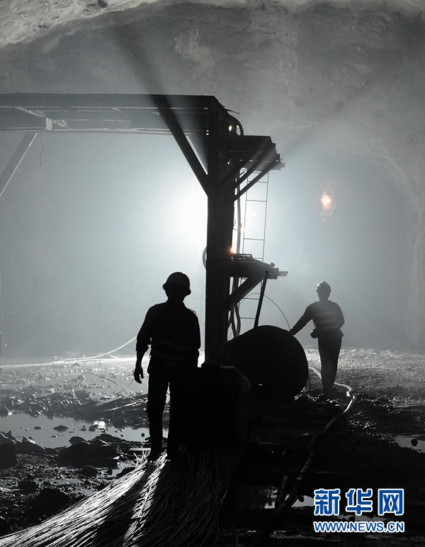 这是5月16日在老挝南部阿速坡省南公1水电站拍摄的两名工人。新华网发 刘艾伦摄