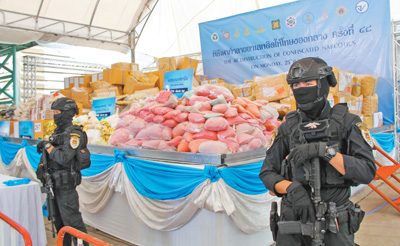 6月25日清晨,近十辆警车闪着警灯,从曼谷北郊的泰国公共卫生部出发,护送着满载毒品的3辆货车,驶往百公里外的大城府邦巴茵工业园,货车上装的是即将焚毁的毒品。在荷枪实弹的特警严密护卫下,14.7吨毒品被投入高温炉内付之一炬。泰国禁毒委员会副秘书长威猜告诉本报记者:“当天销毁的毒品中6.3吨来自司法部门已结案的7245起案件,价值137亿泰铢(1美元约合32泰铢),8.4吨来自国家警察总署查获的毒品。”