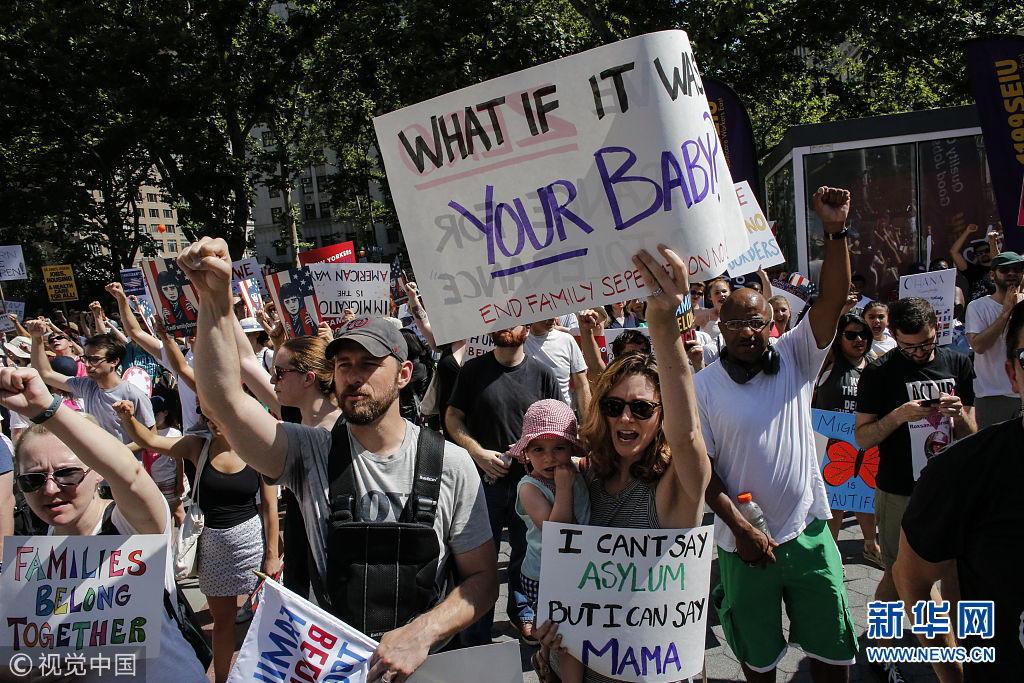 当地时间2018年6月30日,美国纽约,示威者参加“让家庭团聚”游行,抗议特朗普移民政策。(图片来源:视觉中国)