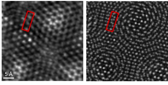 这是领先于过去成像方法的一个重要步骤,以前看不清是因为探测器只收集了一部分散射的电子。此前,在同样的低电压情况下,得到的空间分辨率一般小于0.1纳米。两张图相比,一个线条模糊,一个能看得颗粒分明。