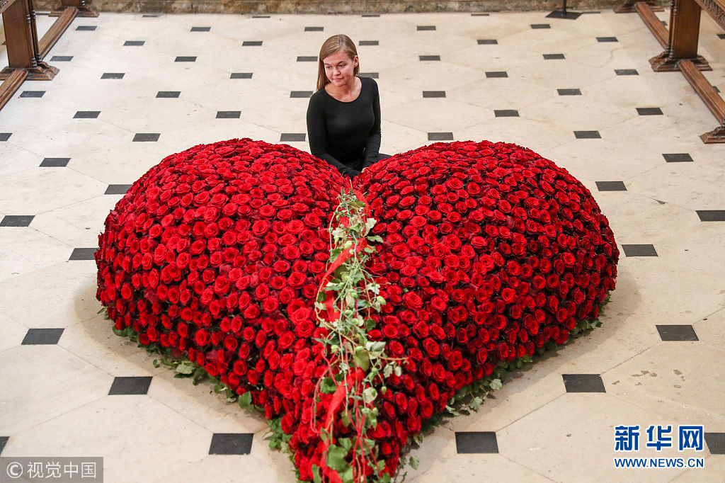 英国温切斯特大教堂鲜花节将开幕 巨型玫瑰心抢眼