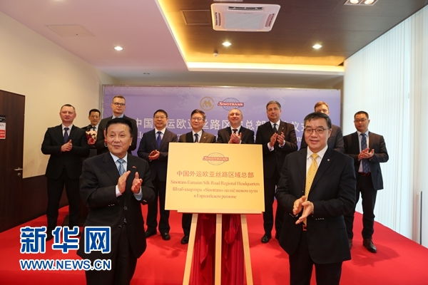 招商局集团董事、招商局集团驻白俄罗斯代表处首席代表胡政(前左)与中外运股份公司总经理李关鹏(前右)共同为中外运欧亚丝路区域总部揭牌。新华社记者 魏忠杰 摄