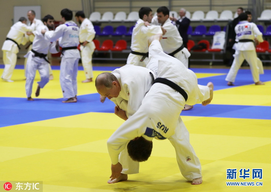 2019年2月14日,俄罗斯索契,俄罗斯总统普京视察运动队,与俄罗斯柔道国家队一起训练和运动员过招,身手矫健。(图片来源:东方ic)