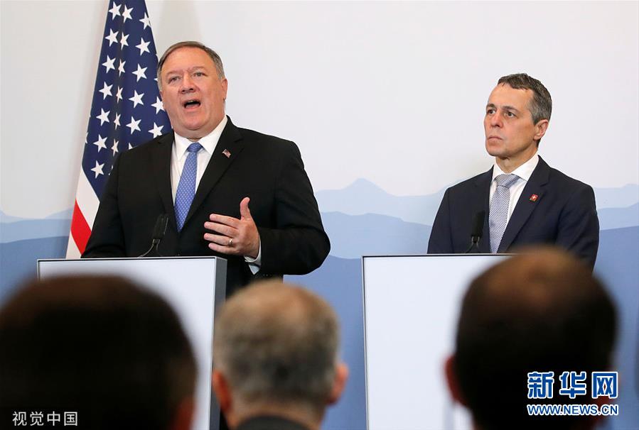 当地时间2019年6月2日,瑞士贝林佐纳,美国国务卿蓬佩奥在与瑞士联邦委员兼外长卡西斯举行的联合新闻发布会上说,美国随时准备坐下来和伊朗展开会谈,但是美国迫使伊朗“改变行为方式的努力”不会停止。(图片来源:视觉中国)
