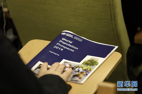 这是6月17日在位于纽约的联合国总部拍摄的《世界人口展望2019:发现提要》报告。新华社记者 李木子 摄