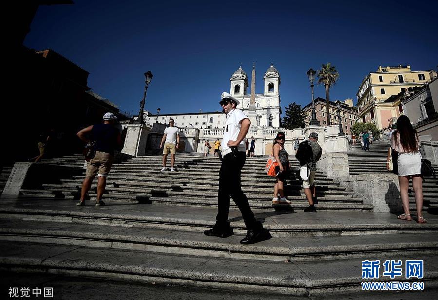 当地时间8月6日,意大利罗马,当地警察在三一教堂外著名景点西班牙阶梯附近巡逻,作为整治旅游不文明行为的一部分,禁止游客坐在景点的台阶上。(图片来源:视觉中国)