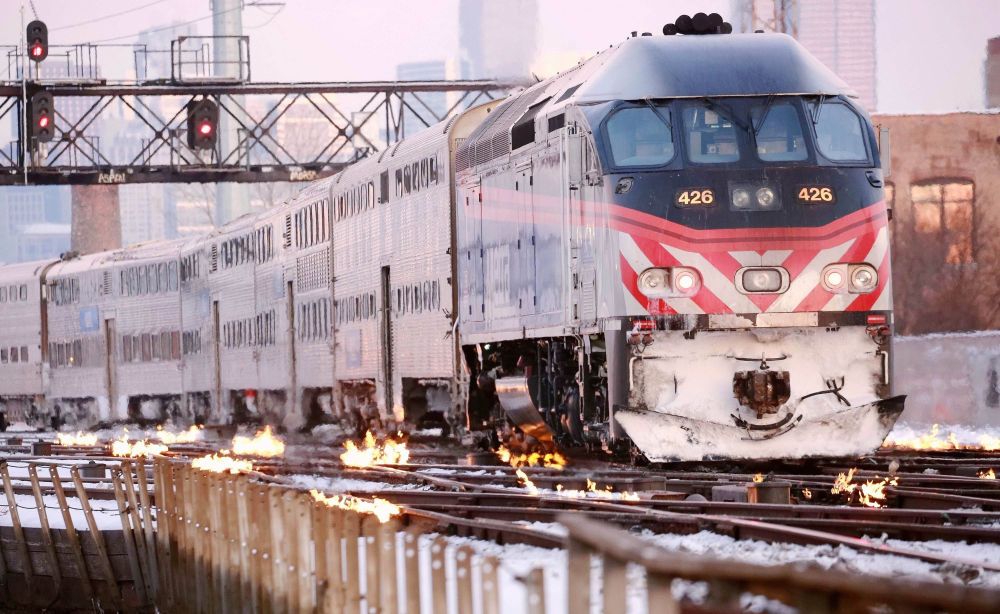 2019年2月1日,在美国芝加哥的西部大道车站,一辆火车从“着火”的铁轨上驶过。芝加哥遭遇零下30摄氏度的极低气温。为防止铁轨被冻裂或收缩变形,铁路工作人员 “火烧铁轨”,确保铁路交通正常运转。新华社记者 汪平 摄