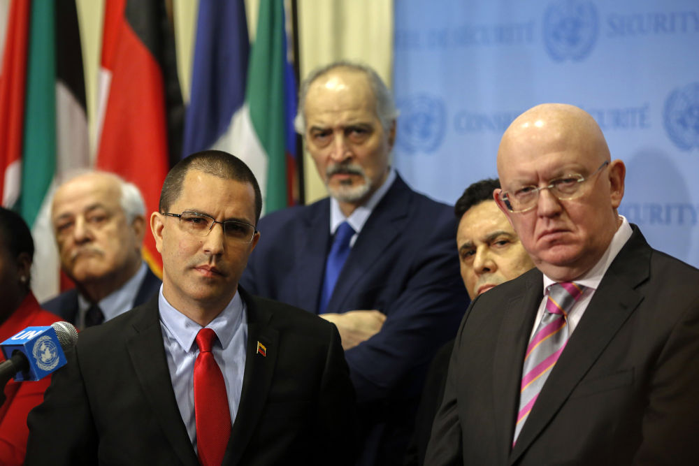 2019年2月14日,在位于纽约的联合国总部,委内瑞拉外交部长阿雷亚萨(前左)、俄罗斯常驻联合国代表涅边贾(前右)和叙利亚常驻联合国代表贾法里(中)等共同参加记者会时聆听提问。阿雷亚萨当天表示,部分联合国会员国决定组织起来,共同捍卫正遭践踏的《联合国宪章》。新华社记者 李木子 摄