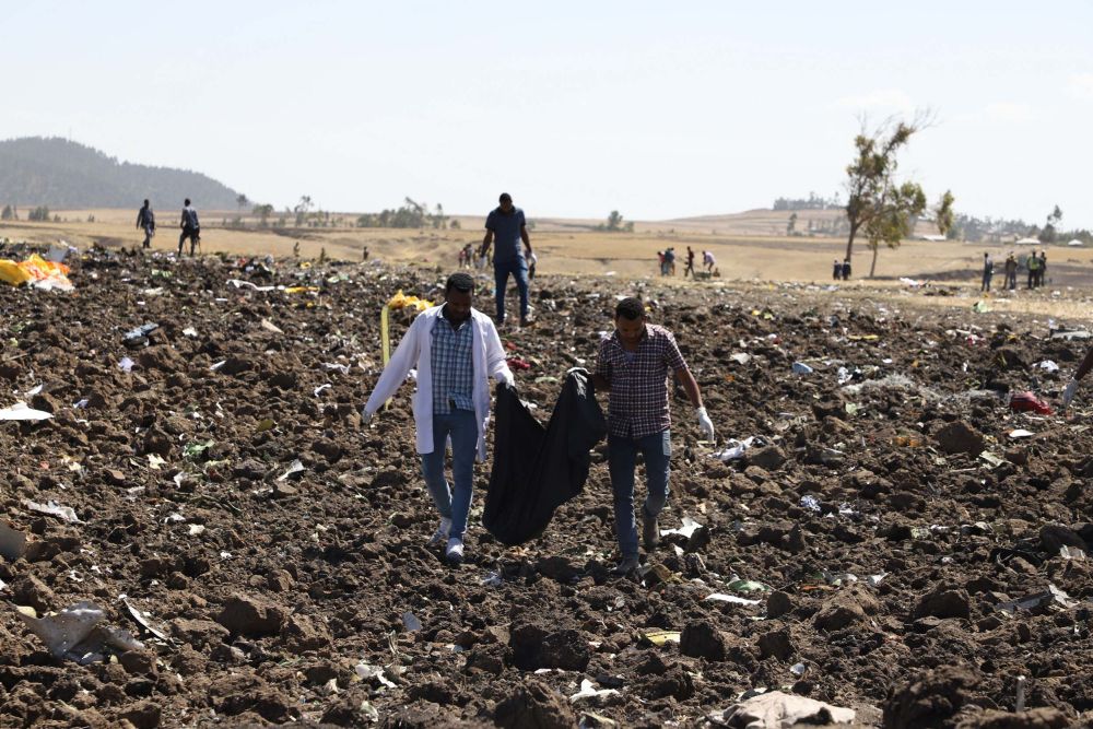 2019年3月10日,在埃塞俄比亚首都亚的斯亚贝巴附近,救援人员搜寻坠机遗骸。埃塞俄比亚航空公司一架从亚的斯亚贝巴飞往肯尼亚首都内罗毕的客机当天坠毁,机上157人全部遇难,其中包括8名中国人。新华社发(迈克尔·特韦尔德摄)