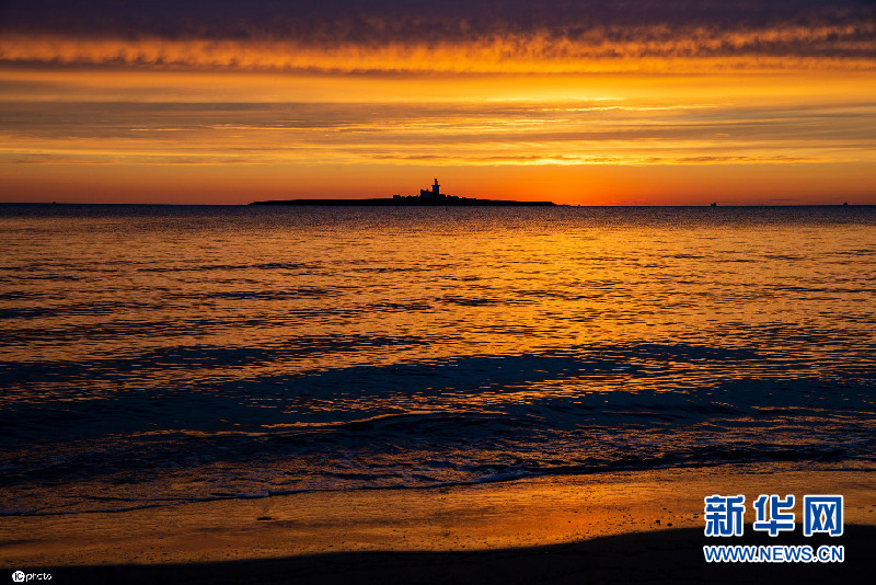 英国诺森伯兰科凯特岛海上升朝阳 霞光灿烂美不胜收