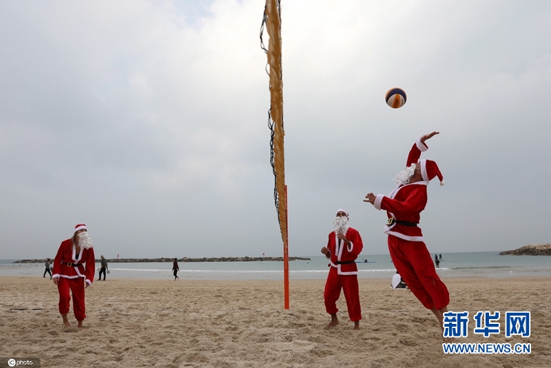悠闲自在!以色列“圣诞老人”海滩打排球