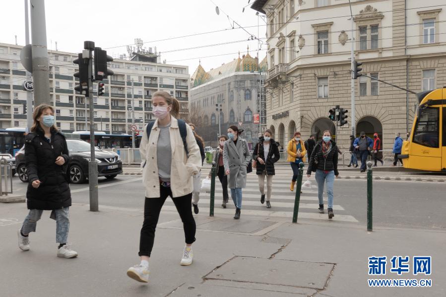 3月4日,在匈牙利首都布达佩斯,人们佩戴口罩走在大街上。新华社发(弗尔季·奥蒂洛 摄)