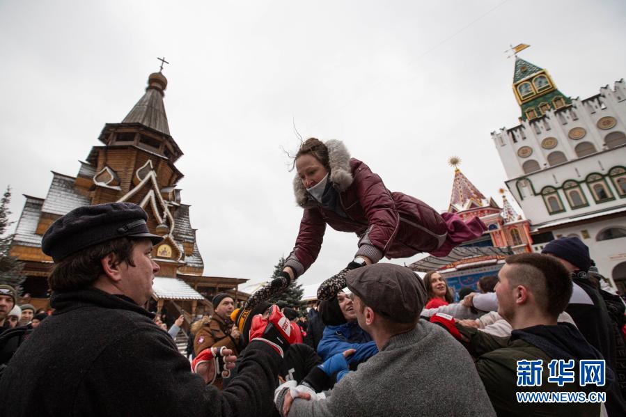 3月13日,在俄罗斯首都莫斯科,人们在谢肉节庆祝活动中将一名女子抛起。