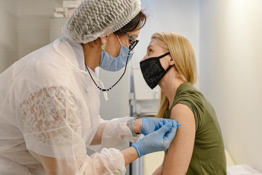 3月23日,在俄罗斯首都莫斯科,一名女士接种新冠疫苗。新华社发(叶甫盖尼·西尼岑摄)