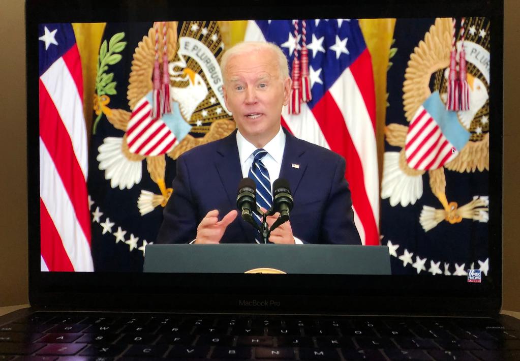 3月25日在美国弗吉尼亚州阿灵顿拍摄的视频画面显示,美国总统拜登在华盛顿白宫举行的记者会上讲话。新华社记者刘杰摄