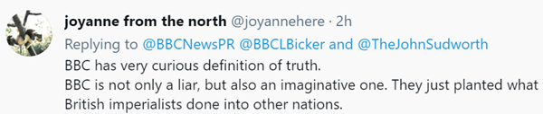 福迪继续指出,“BBC现在甚至都没有试图掩盖这一点”,并提到“BBC天文级别的傲慢、对相反观点的蔑视和平庸的自以为是,确实让它成为了这个星球上最令人难以忍受的新闻机构”。“BBC在中国自断退路这一点上只能怪它自己。尽管它躲在‘新闻自由’的口头禅后,假装自己是真理的仲裁者,但BBC在制造共识以反对中国、并发动新冷战方面,扮演了啦啦队长的角色。”