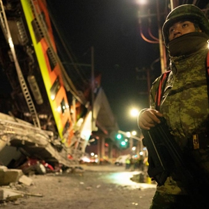 5月3日晚,军人在墨西哥首都墨西哥城的坍塌现场警戒。新华社发(戴维 摄)