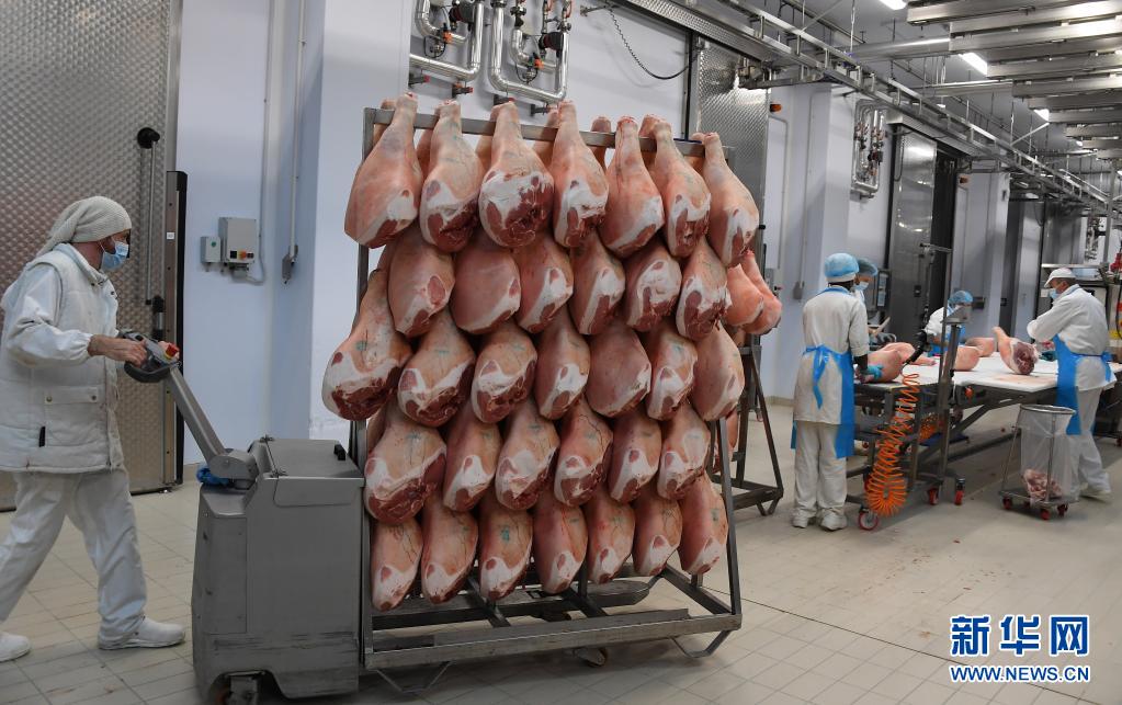 4月13日,在意大利帕尔玛的一家公司工厂,一名工人运送猪腿。