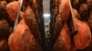 经过一段时间的风干,火腿被转移到地窖中,这里空气稀薄、光线不足,火腿被挂在架子上,直到完全熟成。