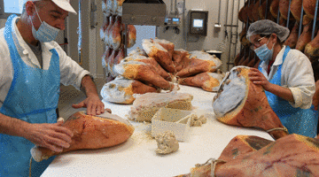 接着,在温度与湿度环境不同的冷藏室里被分阶段静置、悬挂。干室里进行持续稳定的风干过程。到这个阶段的末尾,暴露在外的肉表皮会变干变硬。