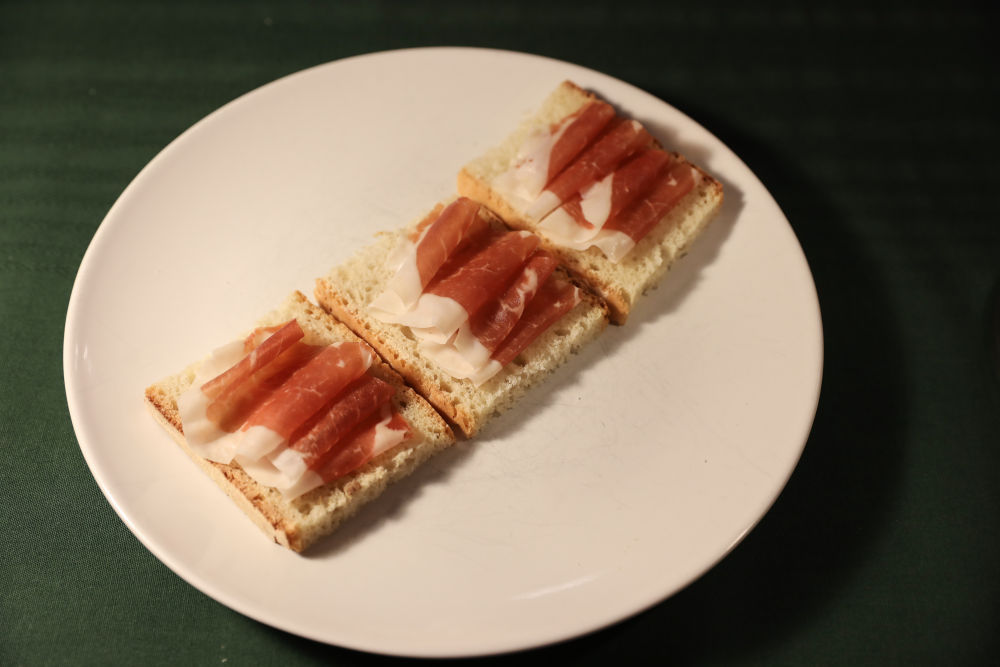 将几片帕尔玛火腿简单地搭配面包,放在盘子上,就成了一道意大利经典的开胃菜。