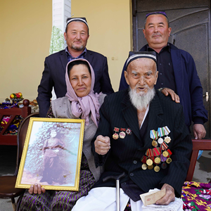 居住在乌兹别克斯坦东部安集延州的阿卜杜拉容·阿卜杜拉苏洛夫老人已经101岁,也参加了对日作战。他对70多年前在中国的经历记忆犹新。听闻有记者要来采访,他专门穿上了挂满勋章、纪念章和荣誉丝带的礼服。