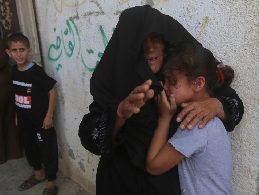5月17日,在加沙地带拉法举行的一场葬礼上,在以军空袭中丧生的巴勒斯坦人的亲属悲痛不已。新华社发(哈利德·奥马尔摄)
