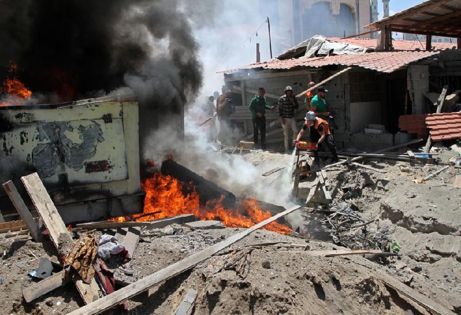 5月17日,巴勒斯坦消防员在加沙城一个被以军空袭摧毁的咖啡厅废墟灭火。新华社发(里泽克·阿卜杜勒·贾瓦德摄)