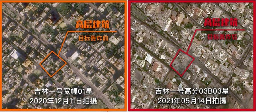 这是加沙地带一栋高层建筑遭以军轰炸前后的卫星对比图。长光卫星技术有限公司供图