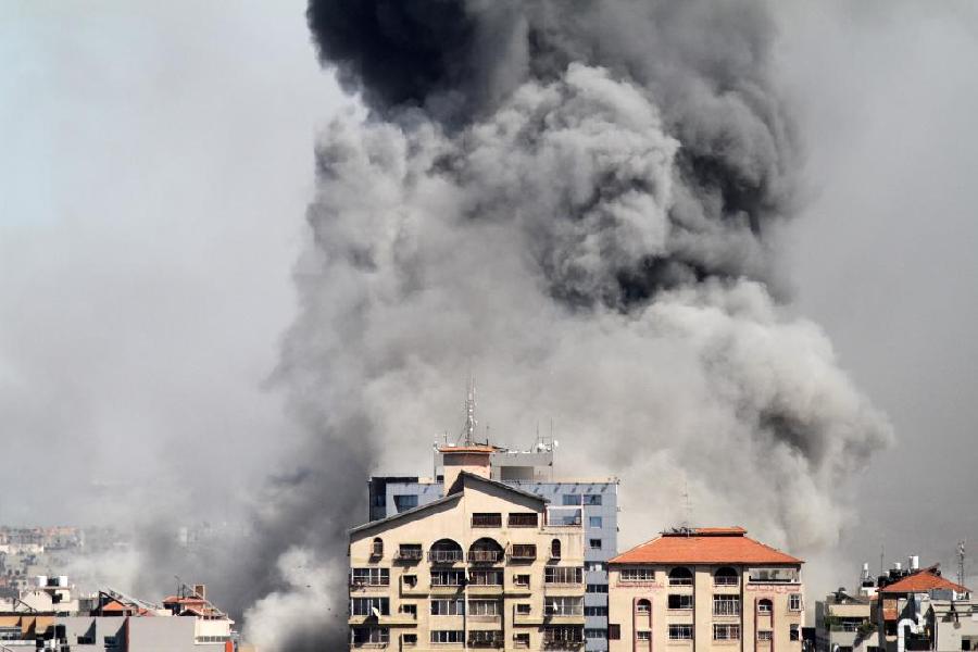 5月15日,加沙地带一栋多家媒体所在大楼被以军空袭后冒出浓烟。新华社发(里泽克·阿卜杜勒·贾瓦德摄)