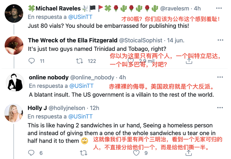 13日,美国驻特多使馆在社交媒体上宣布,美国政府向特多政府捐赠了80瓶辉瑞新冠疫苗,还煞有介事地说:“每支疫苗都很重要”。据媒体报道,80瓶疫苗可供200多人完成两次接种。