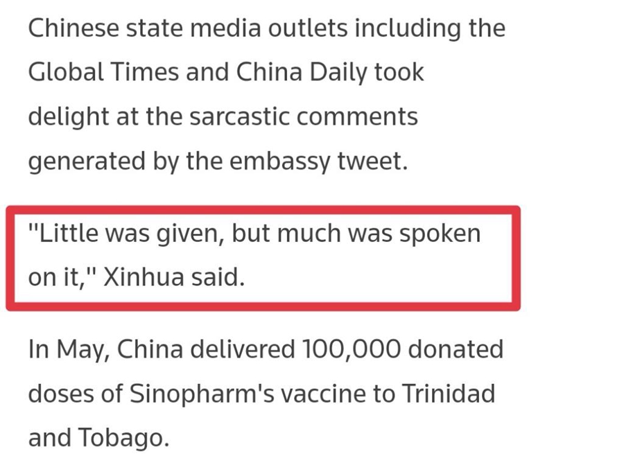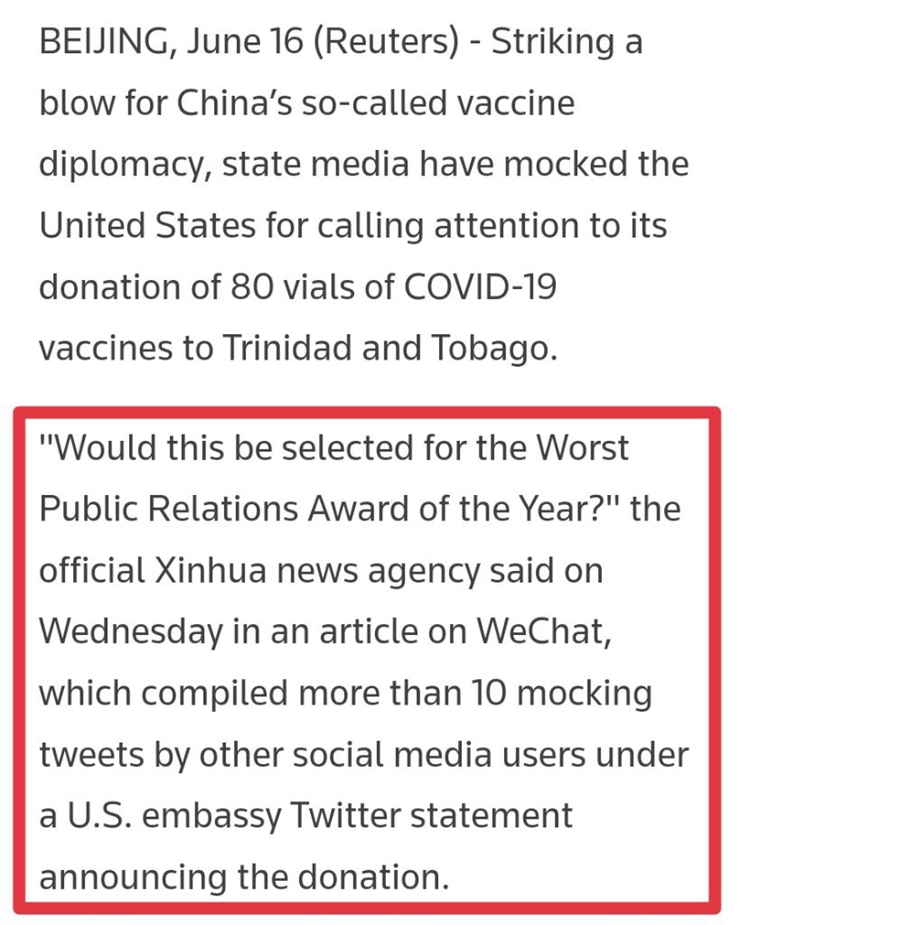 或许是中国网友声势太大,原本“集体沉默”的外国媒体也“绷不住”了,借中国媒体的报道也“损”了美国一把。路透社全方位解读了新华社的一条新媒体稿件,并援引了文中的金句:“给得少,但说得却不少”“不知这一案例能否入选年度最差公关奖?”