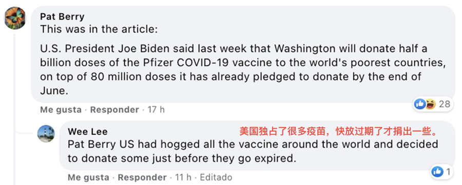 路透社在社交媒体上发布这篇文章后,再次引发海外网友热议。有网友提出新的质疑,美国捐赠的可能是即将过期且用不完的疫苗。