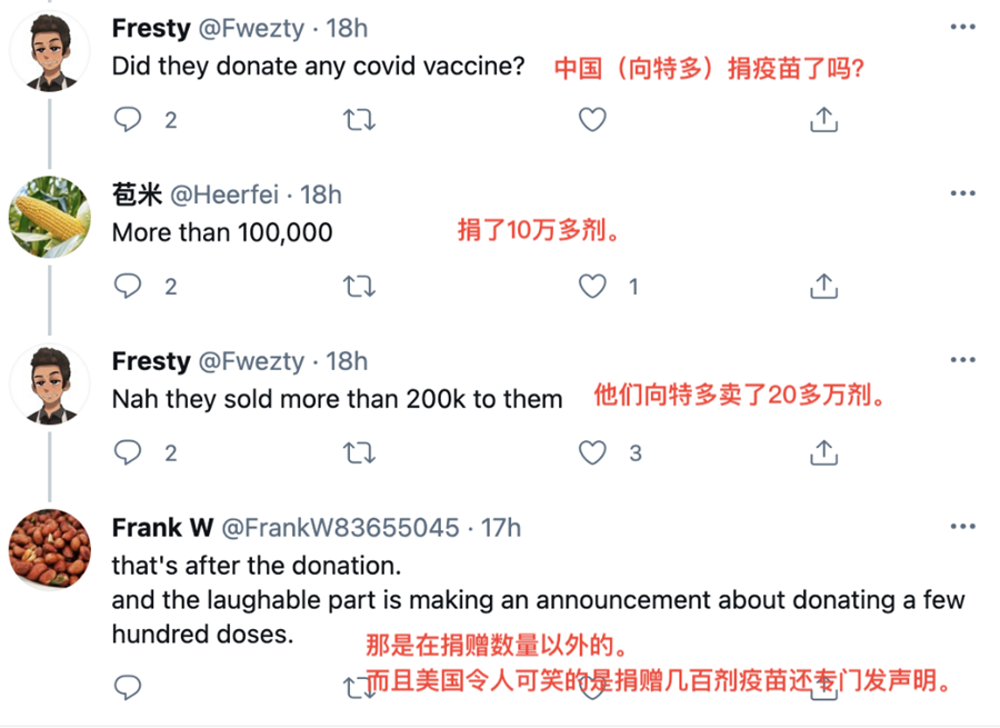 当然,围观者中并非都是“明白人”。估计个别网友是想替美国打抱不平,反问中国有否捐赠疫苗。不曾想,直接问到了点子上。