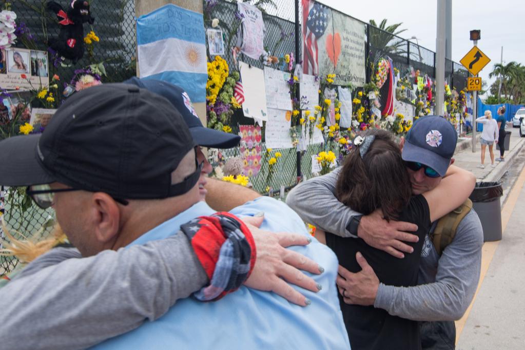 7月7日,人们在美国佛罗里达州迈阿密-戴德县的住宅楼坍塌事故现场附近的纪念墙前相互安慰。新华社发
