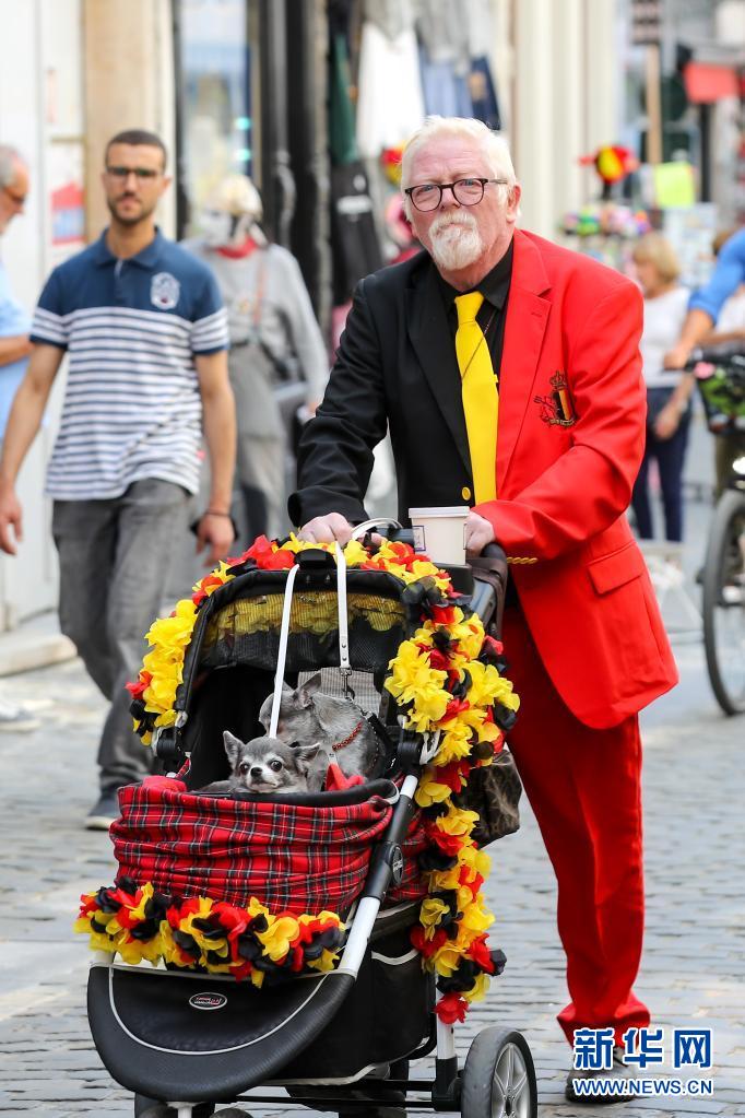 7月21日,一名男子身着比利时国旗颜色的服装在比利时布鲁塞尔庆祝国庆日。