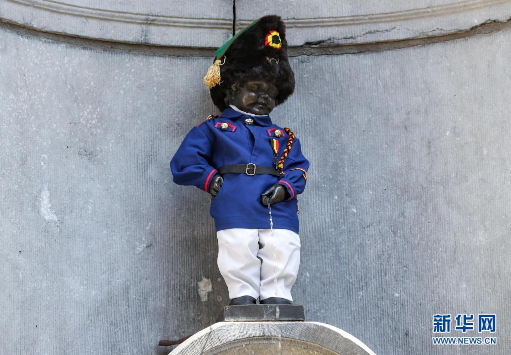 这是7月21日在比利时布鲁塞尔拍摄的穿着比利时独立战争志愿军服装的“小尿童”雕像。