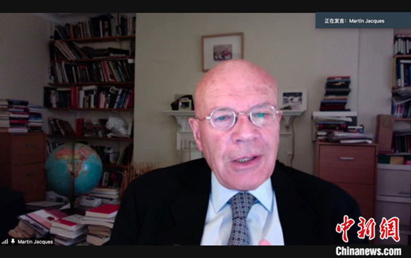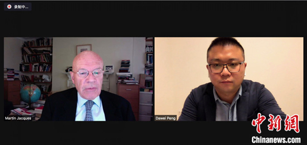 中新社德国分社首席记者、中新网研究院副院长彭大伟近日对话英国著名学者、作家马丁·雅克。图为连线画面。 中新社记者 彭大伟 摄