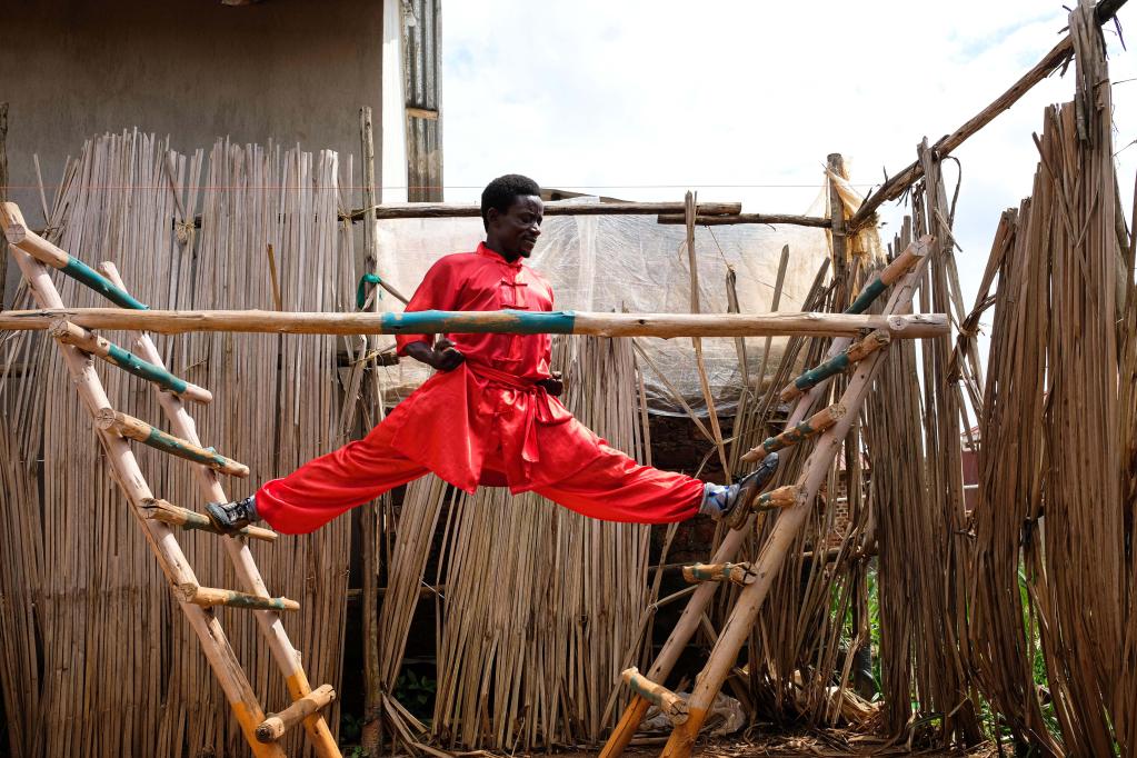 2021年8月23日,在乌干达瓦基索区的卡图克镇,武术教练基扎·玛尼苏鲁·塞吉姆巴正在练习中国功夫。新华社发