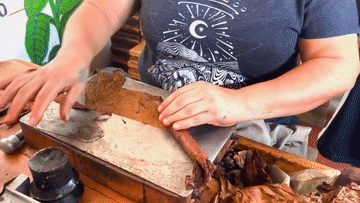 制作雪茄的工序繁多,首先把采摘回来的烟叶晾干,去除烟叶上粗壮的叶脉,再选出质量最上乘、柔韧性最好的烟叶做外卷叶,把其他烟叶初卷成型,用模具压制成型,最后包上外皮,一支飘着烟草香气的雪茄就做好了。