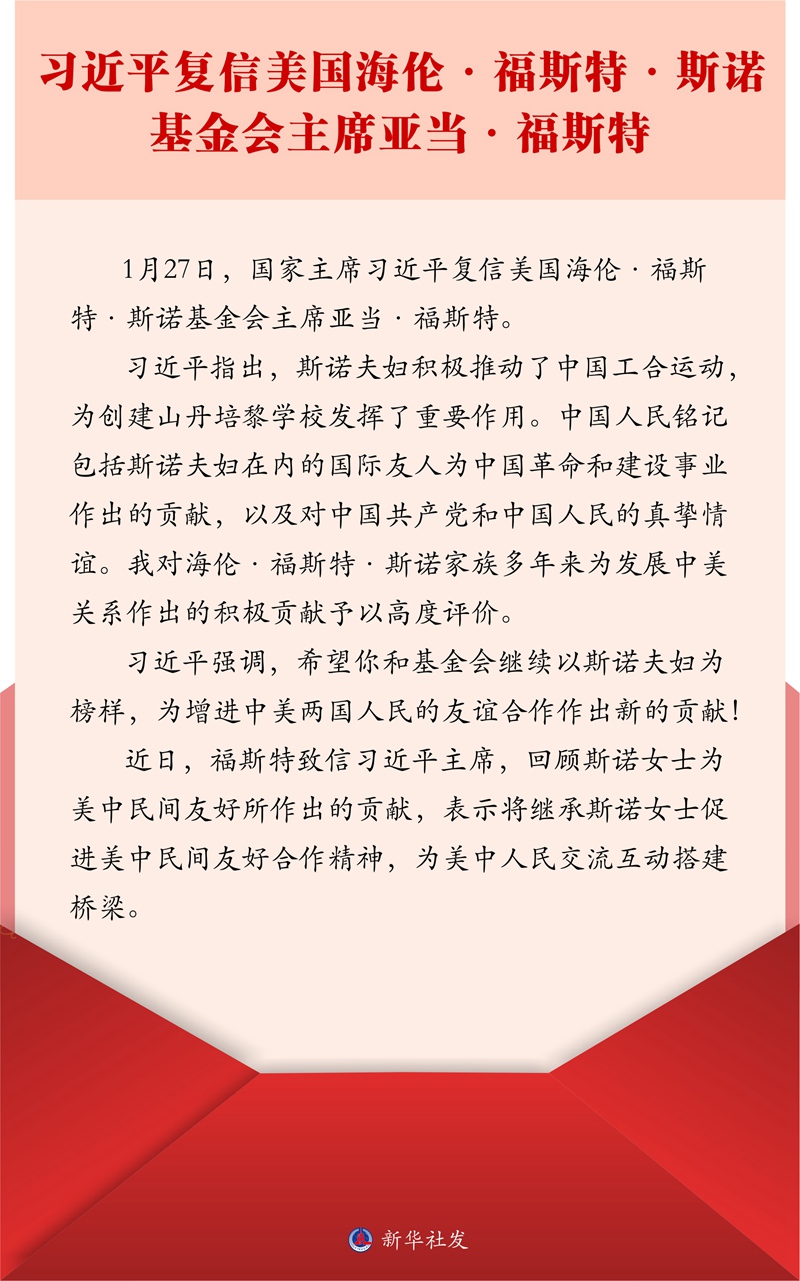 新华社北京2月7日电 1月27日,国家主席习近平复信美国海伦·福斯特·斯诺基金会主席亚当·福斯特。
