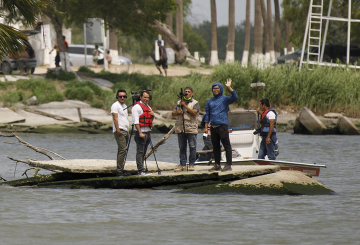 2022年5月2日,新华社驻墨西哥城记者在美墨边境采访,与新华社驻休斯敦记者隔河“相见”。(尼克·瓦格纳摄)