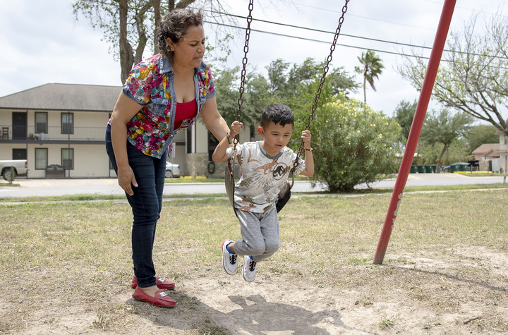 2022年5月2日,美国得克萨斯州伊达尔戈,来自墨西哥的女卡车司机萨拉·希门尼斯在推孙子荡秋千。(尼克·瓦格纳摄)