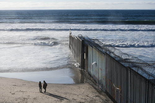 2019年1月10日,在墨西哥边境城市蒂华纳,游客在美墨边境墙边交谈。新华社记者辛悦卫摄
