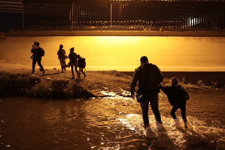 这是2021年3月30日在墨西哥边境城市华雷斯一侧拍摄的海地移民穿过布拉沃河从墨西哥试图进入美国。新华社发(佩纳多摄)