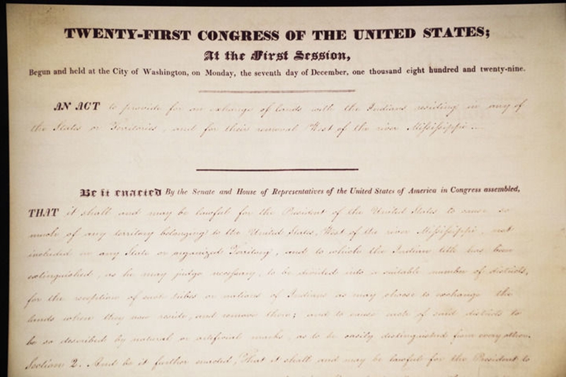 这是5月17日在美国华盛顿拍摄的美洲印第安人国家博物馆里展示的《印第安人迁移法》文件复制品。新华社记者刘杰摄