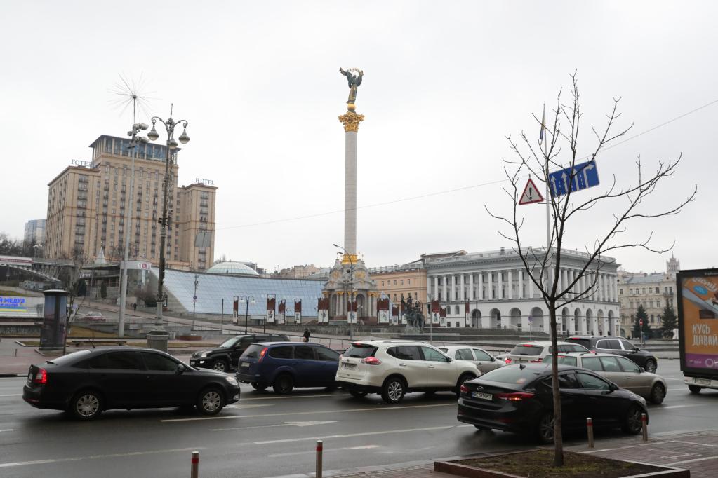 2月24日,车辆从乌克兰基辅独立广场旁驶过。新华社记者李东旭摄