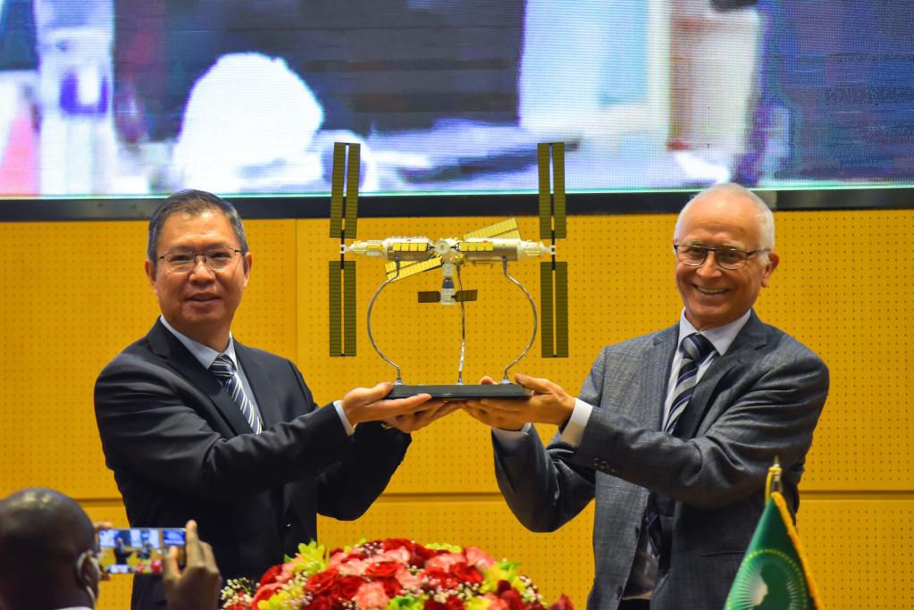 9月6日,在位于埃塞俄比亚亚的斯亚贝巴的非盟总部,中国驻非盟使团团长胡长春大使(左)向非盟委员会教育、科技与创新委员贝勒侯赛因赠送“天宫”空间站模型。新华社发(迈克尔·特韦尔德摄)