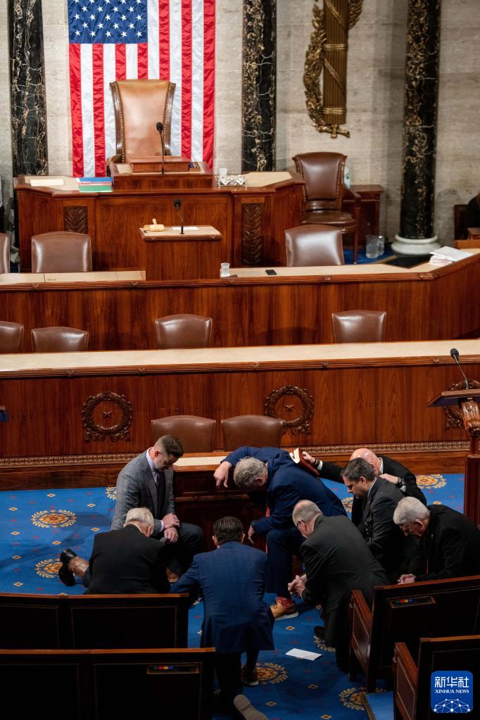 1月6日,在美国华盛顿国会,一些议员在众议院议长选举表决前祈祷。新华社记者 刘杰 摄