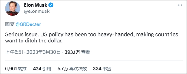 上述种种,导致马斯克都忍不住出来给美元敲敲警钟。他在一位美国财经博主的推文下跟帖说:“美国的政策过于强硬,导致各国都想要抛弃美元。”